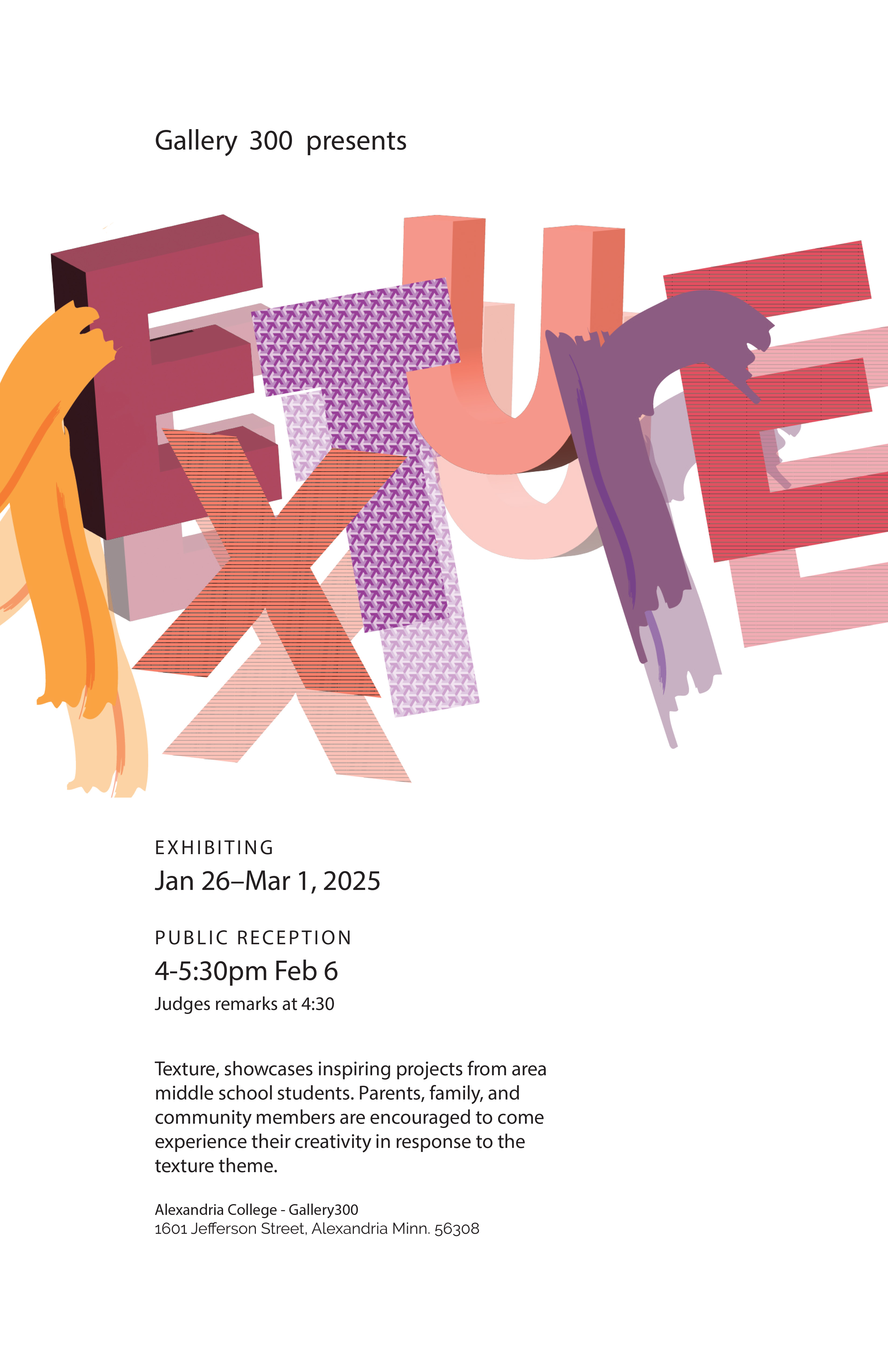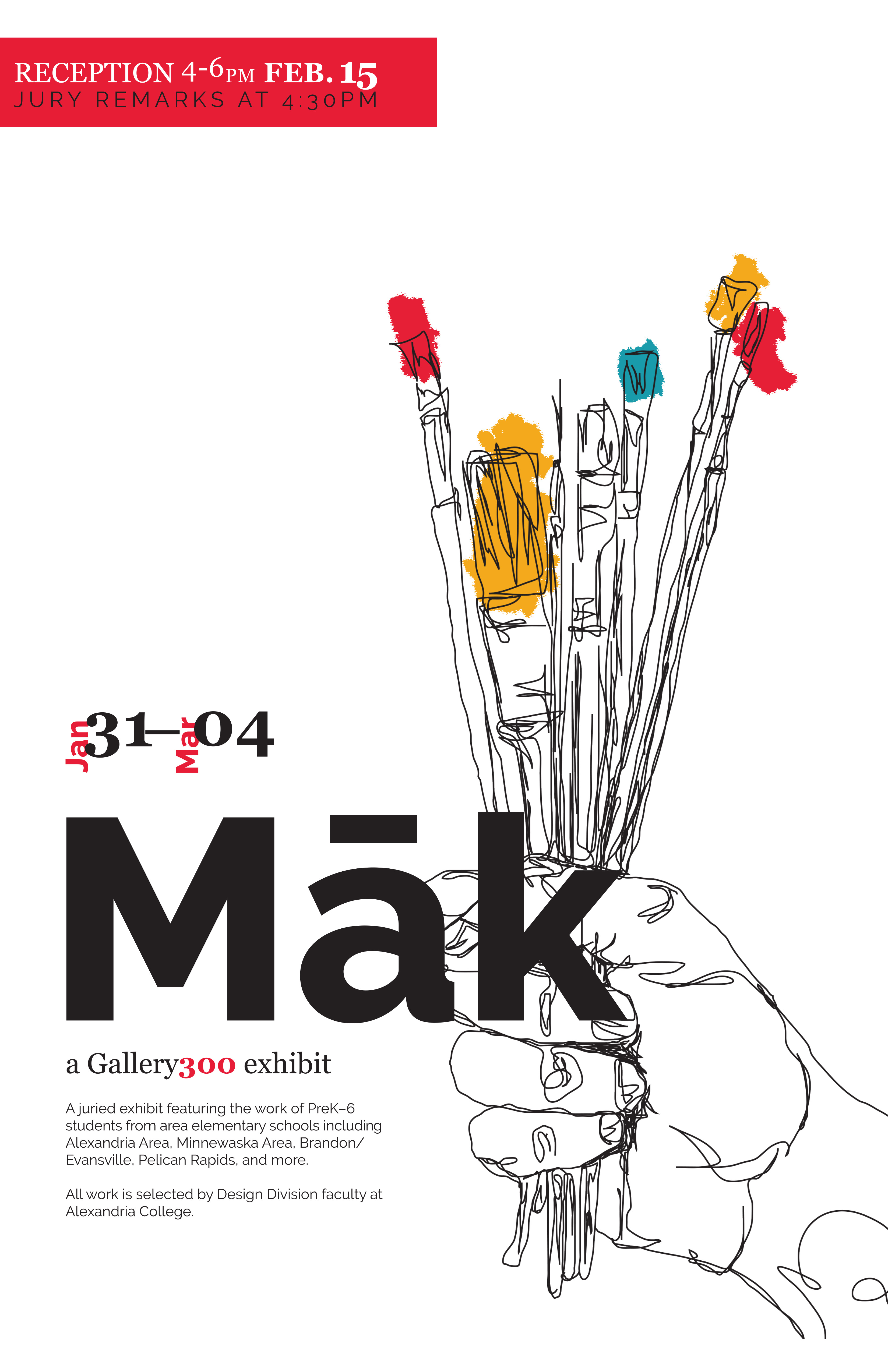 We create and host exhibits showcasing student work from schools in the area. Each exhibit has its own theme that we create posters and social media graphics. We spend time creating print materials to advertise this exhibit, then once we get the student submissions from the area we put together the exhibit hanging the student work with name cards and short descriptions on each piece.